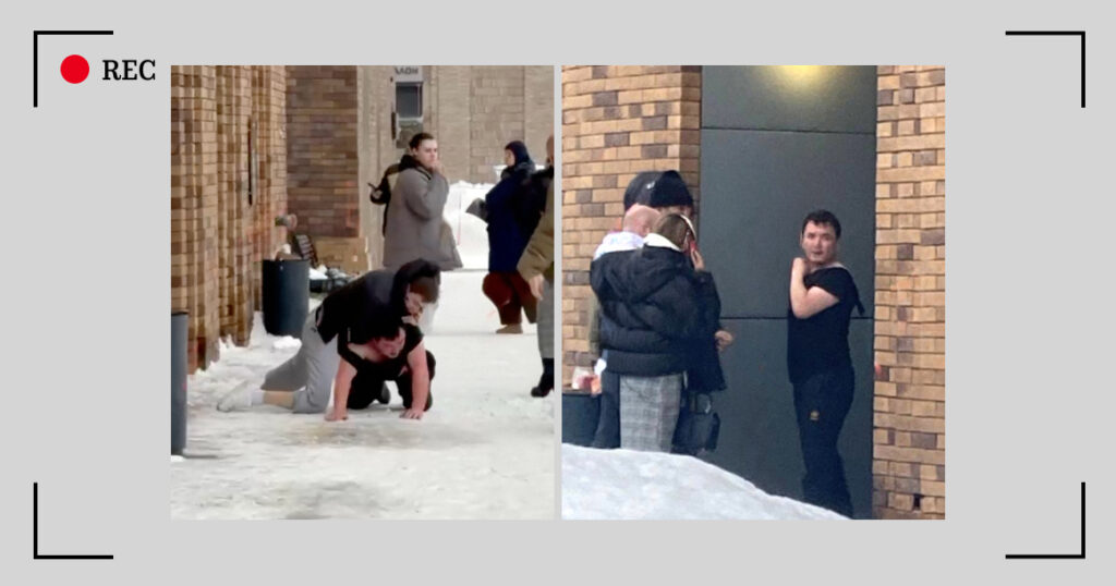Спустя пару минут этот кто-то, видимо, поняв безвыходность своего положения, попытался прорваться наружу и сбежать, прикрывая лицо. Но вот тут уже подключились неравнодушные соседи, и далеко мужчина не ушел. А там уже на место вызвали и полицию.