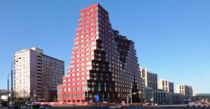 Проект MVRDV продолжает этот ряд. Это не просто известные, но именно модные архитекторы. То, что в Москве построили здание MVRDV, само по себе событие, а то, что сделали, почти не отступив от изначальной концепции — событие вдвойне. Российским партнером стало бюро Аpex, которое выступило в роли генпроектировщика, постаравшись воплотить проект именно так, как он был задуман.