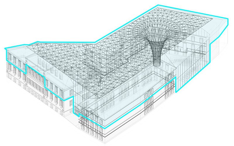 О планах стало известно телеграм-каналу «Стройки — и точка». По его данным, сейчас разработаны два варианта перекрытия двора: «массивный ажурный купол» и «более изящное сетчатое стеклянное решение». Проект разрабатывает НПО «Мостовик», входящее в АФК «Система».