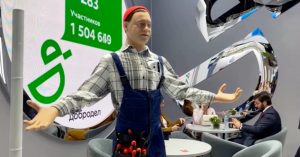 Страшненький антропоморфный робот в красной шапке — это Евгений Нейронович, который встречает посетителей у стенда Подмосковья на ПМЭФ. Его выставил портал «Добродел». Он стал одной из звезд форума, его уже прозвали Жекой и прочат в женихи пермской кибербуфетчице Дуняше, которую продемонстрировали на форуме пару лет назад.