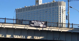А сегодня утром сторонники политика вывесили баннер прямо на Новоарбатском мосту на фоне Белого дома — это реакция на действия полиции. Их мнение хорошо отражает лозунг на баннере: «Дело против Светова — дело против гражданского общества».