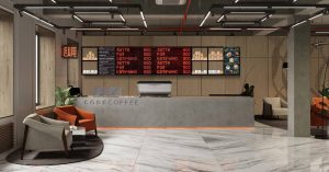 Также показали первую визуализацию интерьера заведения — весьма интересную. Оформлена кофейня будет на стыке футуризма, ретрофутуризма и брутализма — стены, прилавок и потолок выполнены в холодном сером цвете, пол уложен серым мрамором, на сером коврике стоит серое кресло, а под потолком висят узкие серые светильники, напоминающие скорее неприкрытые коммуникации. Однако все это оживляется множеством акцентных элементов оранжевого цвета — вывеской, подсветкой прилавка, оранжевым креслом в пару к серому и даже электронным табло меню, за счет цвета и пиксельности напоминающим старые табло в аэропортах.