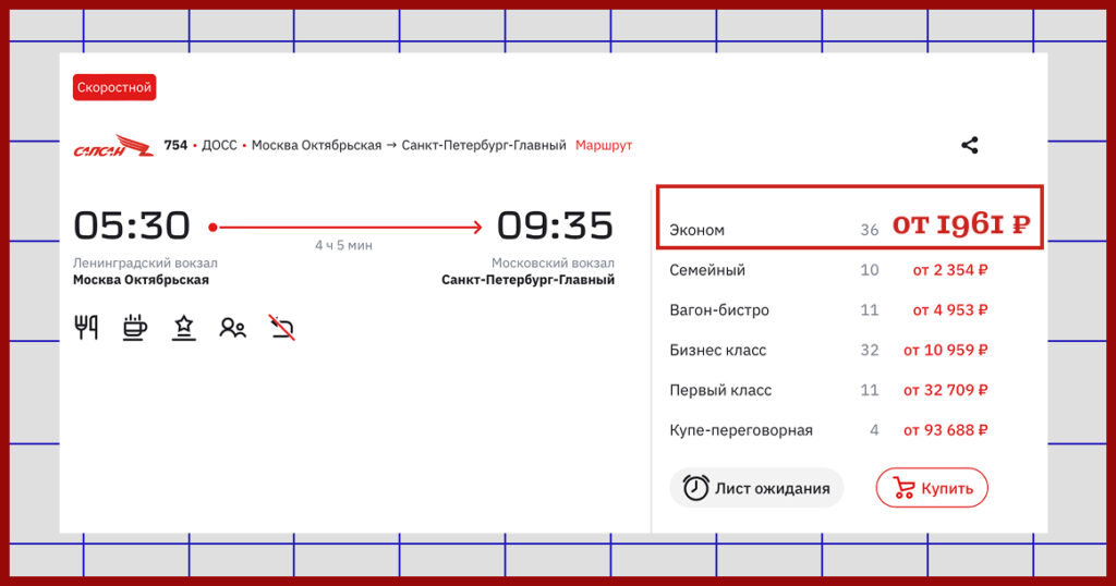В списке — отправления в 5.30 и 5.35: Москва — Петербург и обратно. Сами билеты, надо отдать должное РЖД, действительно продают по фиксированной цене 1961 рубль — в стоимость «зашит» год полета первого человека в космос. И нет, никакой коллаборации с «Роскосмосом» здесь нет, это все инициатива самого перевозчика. Билеты уже появились в продаже на сайте, в приложении и в кассах.