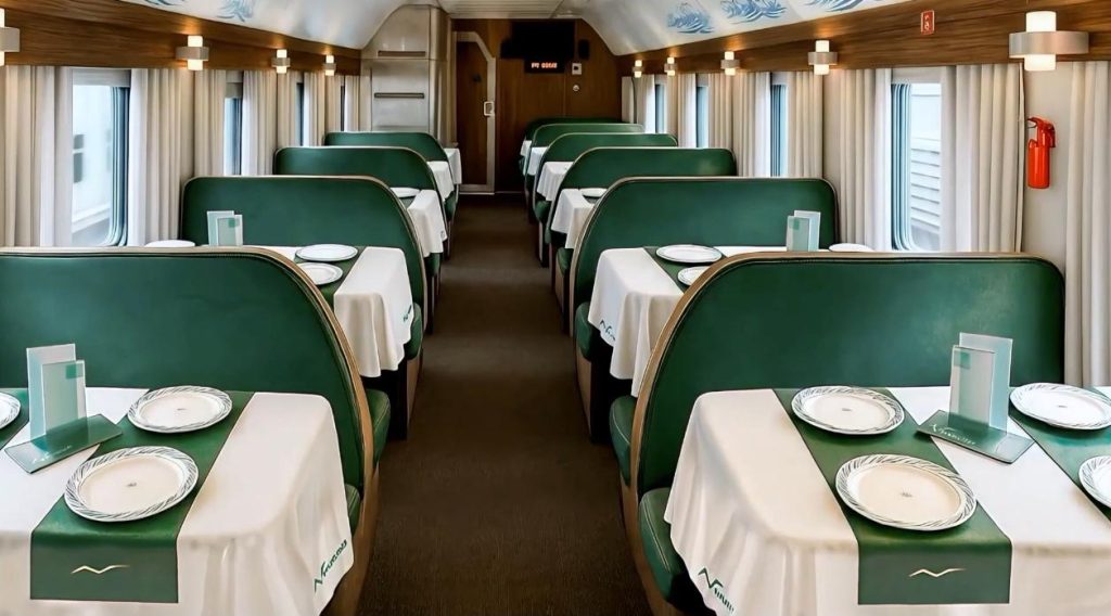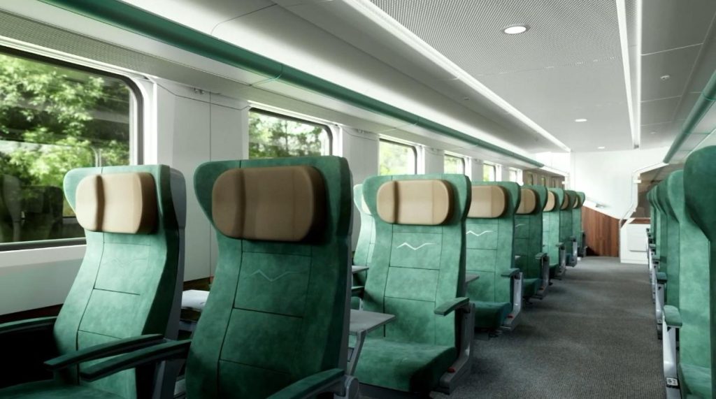 Двухэтажный поезд означает, что будет больше пассажирских мест. Их в 10 вагонах «Буревестника» 730. Помимо сидячих мест есть купейный вагон, СВ и вагон-бистро. Фирменный цвет состава — зеленый (ближе к изумрудному), он используется и в интерьере.