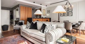 По интерьеру квартира ничем не отличается от остальной элитной недвижимости в районе — непременная гостиная с барной стойкой, диваном и обеденным столом и мраморные ванные комнаты. Квартира находится на пятом этаже жилого комплекса «Литератор», в этой однушке четыре окна, и все они выходят во двор.