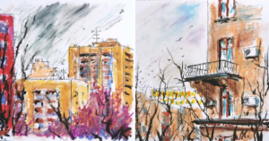«Кто как сидит на карантине, а я рисую вид из окна, поскольку про пленэр пока можно забыть. Может, немного отвлечемся и порисуем свой прекрасный и волшебный район? У каждого же он свой, этот взгляд, но точно есть — привычный, любимый оконный вид», — подписала она иллюстрации.