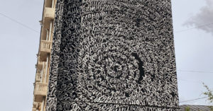 На днях граффити с фирменной каллиграфией Покраса появилось на здании по адресу Большая Якиманка, 35, стр. 1. Работа полностью состоит из имен детей, которые пропали без вести.