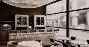 Бар предлагает коктейли-«ощущения» и винную карту, собранную вокруг темы воды. Безалкогольные напитки тоже есть, но пока мало. Интерьер минималистичный, светлый, с большой всепогодной верандой и аккуратной антресолью над кухней.