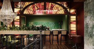 За интерьер отвечал Андрей Царакаев из Modburo. Он создал атмосферу колониального стиля с потертыми стенами, хрустальными люстрами и винтажной мебелью из ротанга.