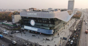 «В новом здании 11 этажей — 6 наземных и 5 подземных. Внешне он напоминает дом-корабль, дизайн которого разработало международное бюро Global Architecture Development. Полупрозрачный фасад с волнообразной геометрией облицован рифлеными алюминиевыми панелями и украшен девятиметровыми часами золотого цвета с авторским узором и красными стрелками, которые станут визитной карточкой комплекса и всего микрорайона», — поведали в пресс-службе «Киевской площади». Часы эти мы уже показывали, вот тут можно посмотреть.