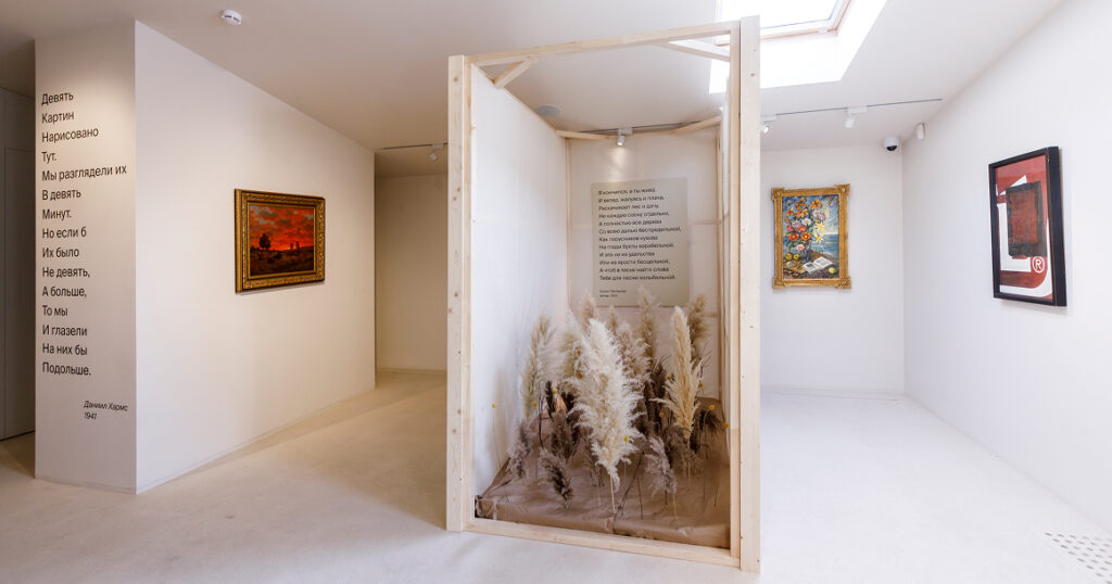 В экспозиции, выстроенной куратором Павлом Котляром, переход от одной картины к другой осуществляется не по хронологии, а по ритму, цвету и интонации. В залах на стенах появляются и поэтические строки — от авторов пушкинской эпохи до Дмитрия Пригова, которые не объясняют картины, а существуют рядом с ними как еще один слой.