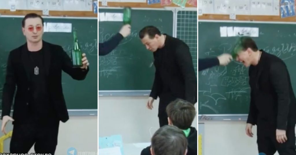 Он рассказал школьникам, как в кино разбивают бутылку о голову. Первый секрет — это сахарное стекло, которое используют при изготовлении реквизитной бутылки: оно довольно легкое, а разбивается красиво и просто, что и продемонстрировал актер.