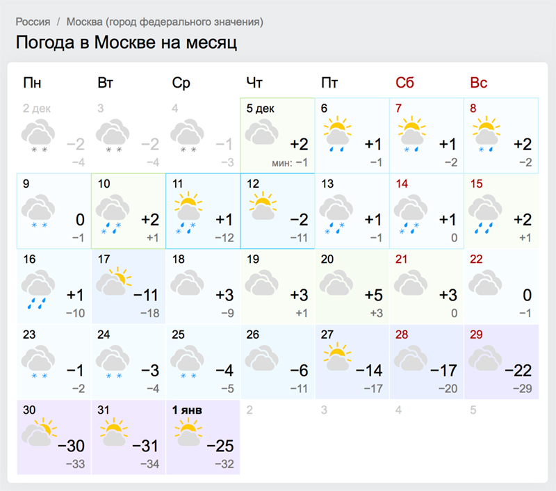Мороза, подобного обещанному, не было с 1978 года. Вообще средняя температура на Новый год в Москве и окрестностях — от минус 8 до минус 10 градусов. Если в Gismeteo не ошибаются, то этот показатель, так сказать, несколько скорректируется.