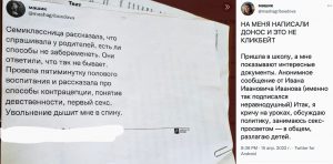 29 марта она написала твит: «Семиклассница рассказала, что спрашивала у родителей, есть ли способы не забеременеть. Они ответили, что так не бывает. Провела пятиминутку полового воспитания и рассказала про способы контрацепции, понятие девственности, первый секс. Увольнение дышит мне в спину».