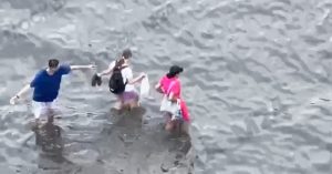 Галантный джентльмен принялся помогать женщинам перейти дорогу. Он встал на неровности и подавал дамам руку, чтобы они чувствовали себя более уверенно в мутном потоке, когда не видно, что у тебя под ногами.