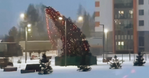 На кадрах елка правда выглядит очень грустно: она сильно согнулась и, кажется, вот-вот упадет. Не похоже, чтобы дерево накренилось под тяжестью гирлянд. Возможно, ее наклонил ветер. А может быть, ее просто неправильно установили. Рядом еще стоят елочки поменьше, совершенно не украшенные, и как будто наблюдают за страданиями праздничного дерева.