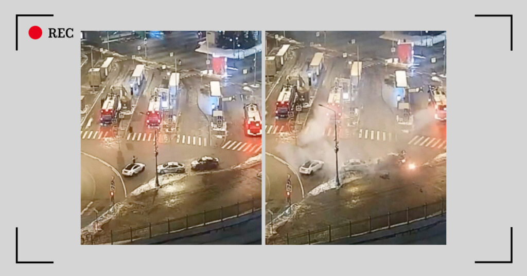 На записи с уличной камеры, несмотря на солидное расстояние, четко видно, как фигура в черном приближается к полицейским машинам, на пару секунд замирает между двумя из них и вроде даже подает одной из машин сигнал светящимся ДПС-жезлом — и в следующее мгновение мы уже видим широкую дымовую завесу.