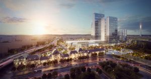 На новых рендерах комплекс стал значительно скромнее, чем во время анонса год назад. Вместо П-образно расположенных высоток, которых планировалось около 12 штук, — линия всего из пяти зданий, плюс три небоскреба позади. А длина крытой галереи, которой центр так хвастался, сократилась примерно с 500 метров до 300. Сам комплекс придвинули заметно ближе к вокзалу.