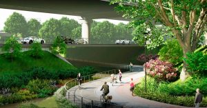 На рендерах видно, что пешеходно-велосипедный путь повторяет изгиб реки Яузы. Помимо пешеходной и велосипедной дорожек будет еще и беговая. Уже сейчас понятно, что соблюдать это распределение потоков никто не будет. Даже рендер максимально близок к реальности: пешеход идет по велодорожке, бегун бежит по пешеходной дорожке. И только мама с коляской еще не решила, на чью территорию ступить: велосипедистов или бегунов.