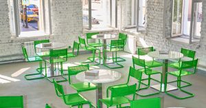 Заведение работает в техническом режиме с начала сентября. Два этажа, два бара, есть веранда. Интерьер простой — сочетание белого с ярко-зеленым.