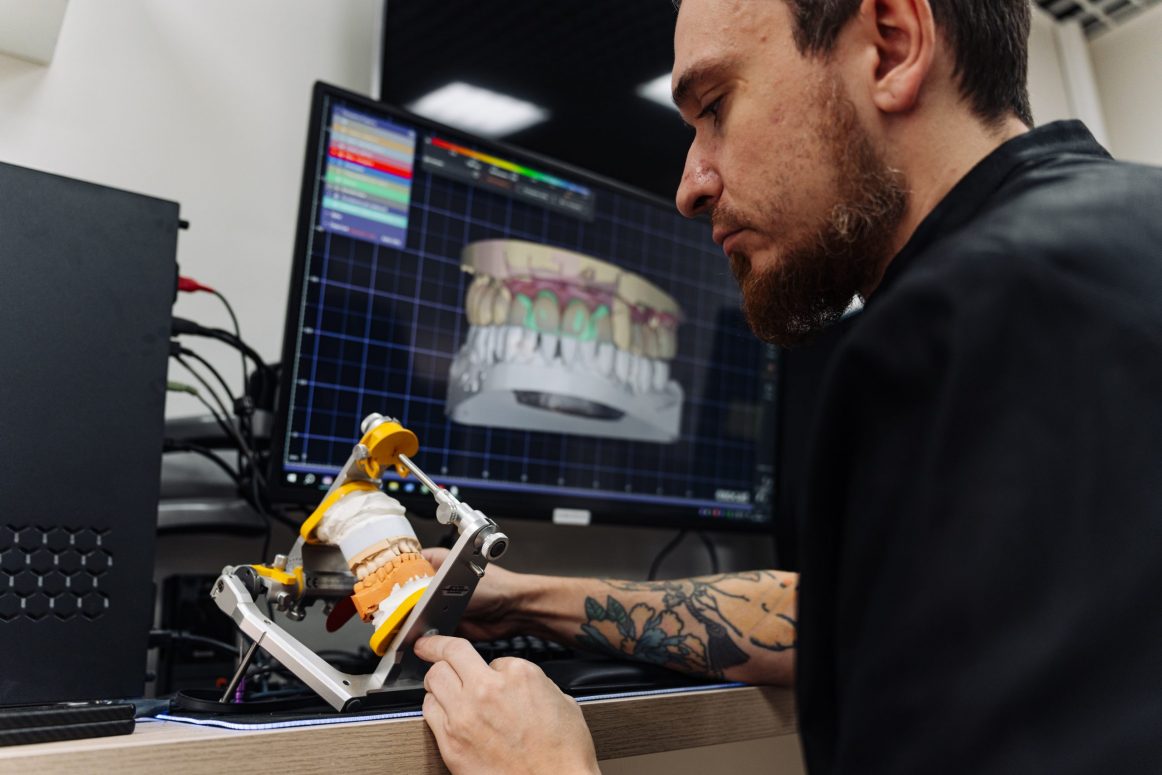 В AMBC этот путь сделали короче. Здесь работают сразу две лаборатории — цифровая и аналоговая. Вместо традиционных слепков используют цифровое сканирование, которое позволяет создавать 3D-модели челюсти и моделировать будущую улыбку еще до начала лечения. Особенно это важно для эстетических реставраций: пациент может увидеть, каким будет результат до того, как начнется лечение, а само оно станет предсказуемым. Параметры движения челюсти фиксируются на артикуляторе и переводятся в цифровой формат, чтобы добиться идеальной точности.