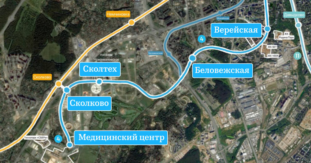 Всего на продлении запланировано пять станций: «Верейская», «Беловежская», «Сколтех», «Сколково» с пересадкой на D1 и конечная «Медицинский центр» на территории кластера. Запуск участка от «Кунцевской» до «Медицинского центра» сейчас обозначен 2031 годом. На самой «Кунцевской» для этого проекта планируют построить дополнительную платформу с северной стороны, чтобы развести пассажиропотоки.