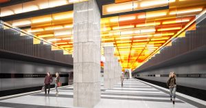 Облик станции достаточно типичен: двухпролетная с колоннами посередине платформы, но вот потолок по крайней мере на рендерах выглядит очень интересно: его украшают оранжевые стеклянные пластины, напоминающие леденцы. Автор новости не припоминает похожего решения ни на одной из станций московской подземки.