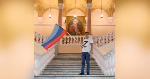 Z-акцию третьекурсник журфака Степан Антропов организовал на главной лестнице с портретом Ломоносова, вернувшись в минувшую пятницу с митинга-концерта «Своих не бросаем». Он устроил фотосессию в футболке с символом Z и флагом ЛНР, которым размахивал в течение пяти минут.