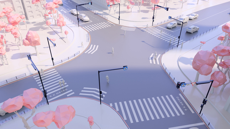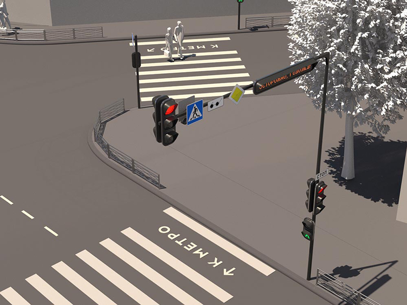 Впрочем, на макетах, опубликованных на сайте студии, все красиво: светофоры с закругленными углами на Г-образных опорах, где помещаются несколько дорожных знаков, бегущая строка с надписями вроде «Все пристегнулись?» и даже фонарь. Удобно выглядит и зебра: вместо одной из полосок там будет указатель «К метро». Диагональные перекрестки лишатся внутренней разметки, вместо нее будут нарисованы стрелки.
