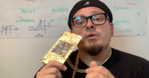 Украшение сегодняшнего дня: сусальное золото и золотая пыль, около сорока кристаллов Swarovski, позолоченная цепь — для того, чтобы повесить на шею. В этом и состоит задумка: молодой человек объясняет, что электронный QR-код быстро теряется в фотоленте на телефоне. Бумажный тоже был — результат тот же, а в рестораны по-другому не пускают.
