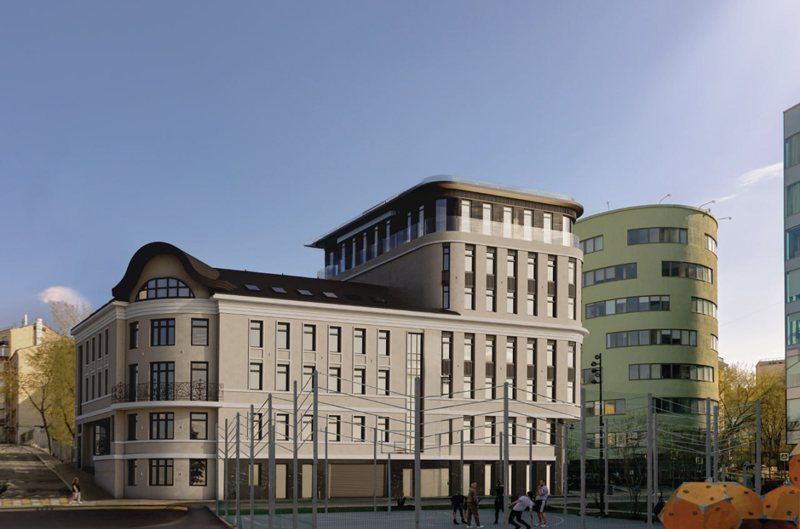 На визуализации показан проект пристройки к зданию 2012 года, в котором с 2018-го располагается «Свинья и роза». Новый объем заметно выше существующего корпуса: верхние этажи с плавно скругленными углами и панорамным остеклением контрастируют с более классической архитектурой оригинала.