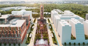 Несмотря на то что на бывшем пустыре за главным зданием уже вовсю идет стройка нового научного кластера, вопрос о том, что же будет находиться между зданиями, оставался открытым — на старых макетах и рендерах были лишь схематично обозначены аллеи и т. д.