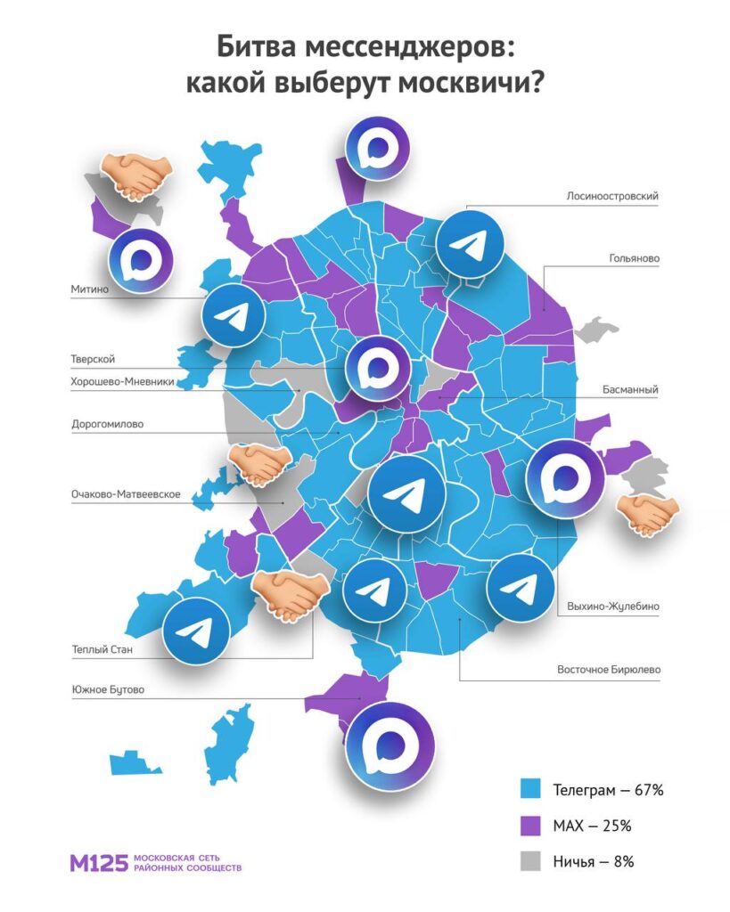 Среди районов, где мнения разделились пополам — Очаково-Матвеевское, Хорошево-Мневники, Гагаринский и Кунцево. В опросе упомянуты и другие варианты для переписки: «VK Мессенджер» набрал 12%, «Яндекс Мессенджер» — 1%, «Одноклассники» — 1%.