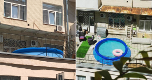 А купаться хочется — в такую-то жару. Вот жильцы дома на Покровском бульваре и обустроили себе импровизированную пляжную зону — да, без песка, но с местами для отдыха и надувным бассейном. Можно купаться на открытом воздухе и никакие курорты не нужны. Воздух не самый чистый, зато виды прекрасные.