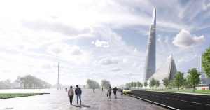Концепция бюро «Меганом», судя по всему, визуально опирается на монумент Победы, установленный в парке (памятник можно разглядеть на рендере вдалеке). Одно здание будет в форме пирамиды, а другое напоминает устремленный вверх перочинный нож.