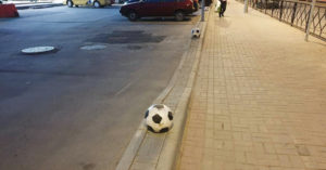 Шутки шутками, но опасность такой инсталляции именно в том, что бетонные сферы идентичны с мячами по размеру и слишком аккуратно и ровно разрисованы, что не похоже на обычно косорукий «Жилищник».