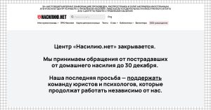 Помогающий пострадавшим от домашнего насилия проект «Насилию.нет» (организация была создана десять лет назад, в декабре 2020 года Минюст признал ее иностранным агентом) объявил, что с 30 декабря перестанет принимать заявки на получение помощи. Текст об этом «Насилию.нет» разместил на своем сайте. В 2021-м организацию дважды штрафовали на 300 тыс. рублей за отсутствие маркировки иноагента в публикациях. В июне команда сообщала о финансовых трудностях и сокращении работы.