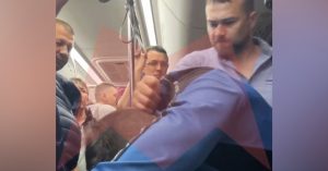 С чего именно началась перепалка, неизвестно. На кадрах пассажир в клетчатой рубашке схватил чем-то разгневавшего его мужчину и яростно выпалил: «Ты кого, офицера ** *** послал? Офицера морской пехоты?!» При этом он то толкал его, то бил коленом по голове, держа за воротник.