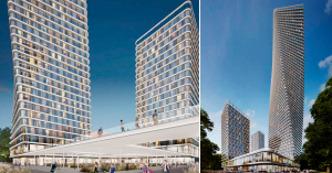 Судя по изображениям, у парка планируется возвести три башни разной этажности — они расположатся по адресу ул. Софьи Ковалевской, 1, корп. 1. Самую высокую хотят сделать винтообразной — на картинке она выглядит как упрощенная версия «Эволюции» в «Сити». При этом высота небоскреба не уточняется, хотя расчет явно на то, что он станет доминантой Дмитровского района.