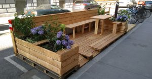 Парклет — это небольшая зона отдыха, которая занимает место для парковки. Их устраивают в один уровень с тротуаром. Обычно парклет выполняется из дерева — предполагается, что конструкция легко собирается и разбирается. Могут украсить парклет искусственной или живой растительностью.