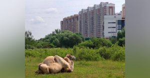 Судя по комментариям пользователей, верблюда зовут Гоша, живет он в конюшне в Язово (это деревня по соседству в Новой Москве) и уже не первый раз приходит навестить рогатых подружек.