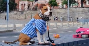 Сегодня День ВДВ вместе со своим хозяином Михаилом отмечала собака по кличке Джерси. Они расположились на лавочке недалеко от собора Василия Блаженного. Михаил рассказал, что когда-то забрал Джерси у хозяев-алкоголиков, которые довели собаку до ужасного состояния. По словам Михаила, она была очень худой.