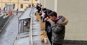 Архитектура МДМ располагает к тому, чтобы поесть у входа в кафе: сегодня дождливо и ветрено, а там как раз есть крыша. Бортик здания удачно превратился в импровизированную барную стойку. Зимой, конечно, все это никого не спасет — слишком холодно, но будем надеяться, что эти ограничения ввели действительно всего на неделю, а не до 1 января, как некоторые сплетничают.