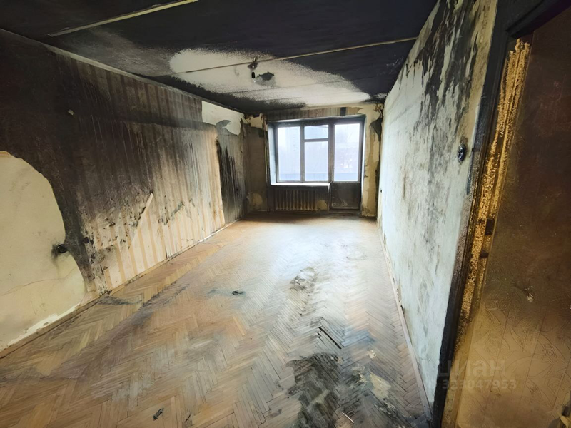 Собственник честно предупреждает: в квартире был пожар, который «оперативно ликвидировали». При этом «в двух комнатах можно жить, проведя тщательную влажную уборку». Почти нет мебели, стены в копоти — такой «лофт с историей».