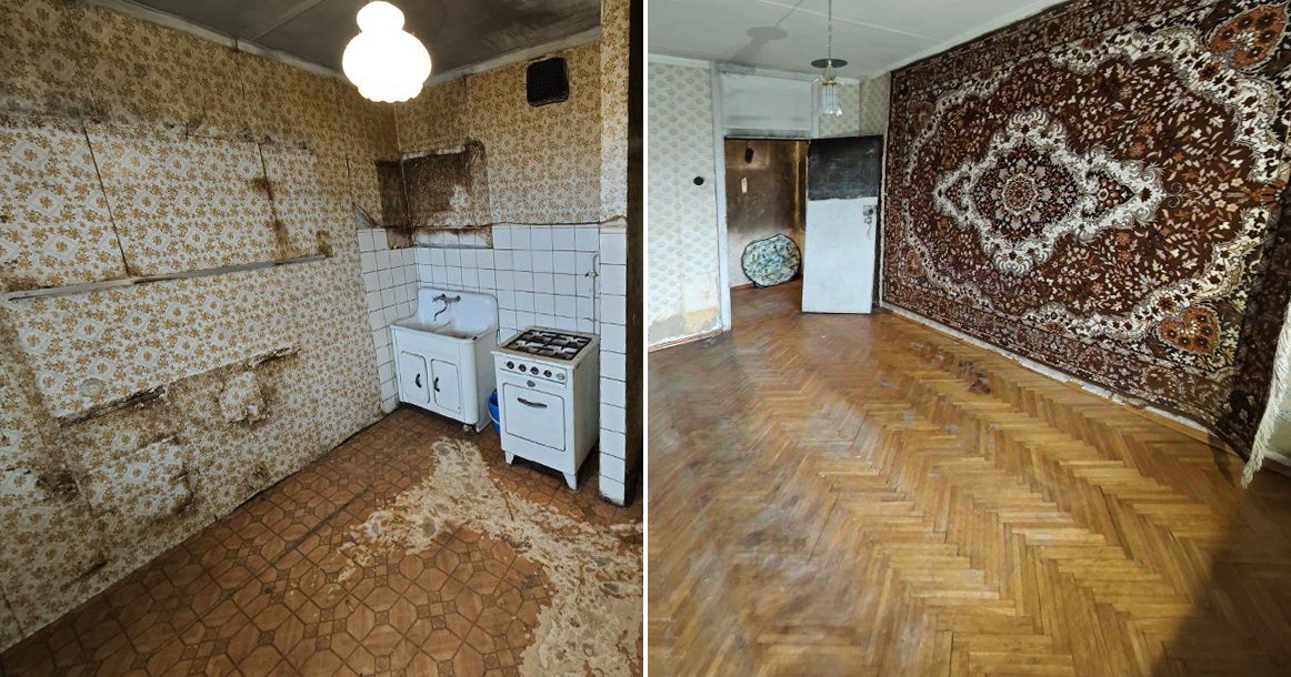 Собственник честно предупреждает: в квартире был пожар, который «оперативно ликвидировали». При этом «в двух комнатах можно жить, проведя тщательную влажную уборку». Почти нет мебели, стены в копоти — такой «лофт с историей».