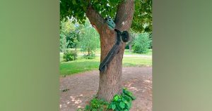 Фото опубликовал телеграм-канал «Кузьминки М125». Кто и зачем решил поместить самокат на дерево перед входом в парк — неизвестно: возможно, владелец не захотел нести его на помойку и решил избавиться от него таким нетривиальным образом.