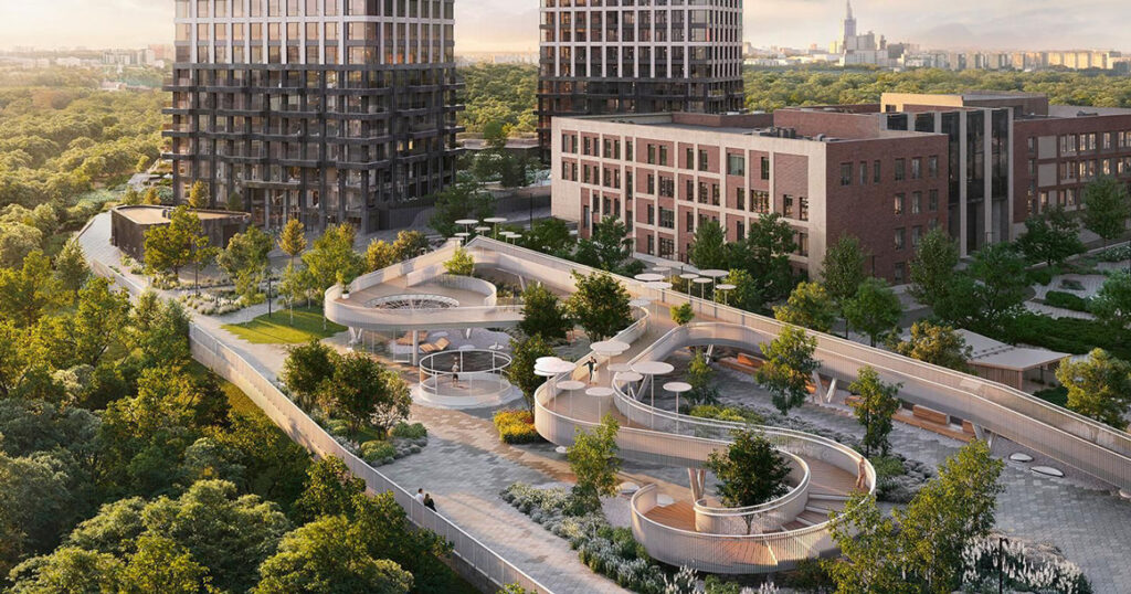 По задумке архитекторов, это будет многоуровневый бульвар с террасами, амфитеатрами и плавным рельефом — с желанием встроиться в местный ландшафт, а не спорить с ним (конечно, те же критерии хотелось бы применить и к самой застройке). Главный архитектор Сергей Кузнецов описывает концепцию через природные стихии: «горная река», «склон», «каменный сад» — в виде плитки с рябью, зеркальных поверхностей и лабиринта. Белые ленты пандусов закручиваются петлями, переходя с уровня на уровень. Где-то это прогулка с видом на зелень Сетуни, где-то карманы с лавками, столами и навесами.