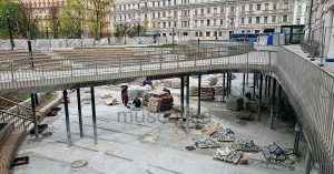 В прошлый раз плитку здесь разбирали осенью. Тогда мы выразили надежду, что работы намекают на скорое открытие музея, но не тут-то было: недавно открытие музея снова перенесли, предварительно на 2025 год. Музей закрыт уже девять лет, а стоимость работ за это время выросла в 2,5 раза (и может вырасти еще).