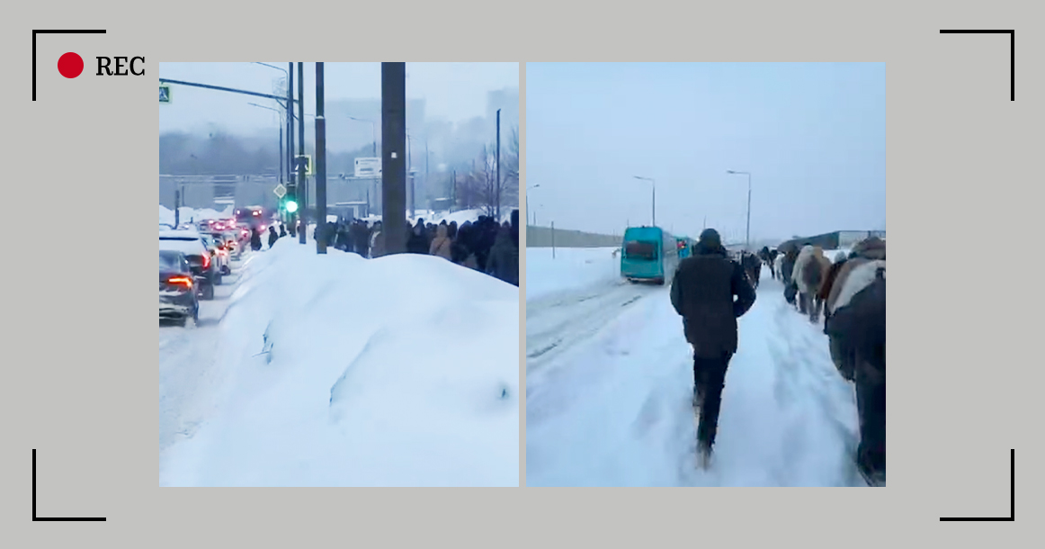 Длинные колонны людей сегодня шли пешком, потому что автобусы не могли проехать к остановкам из-за снега. Пассажиров приходилось высаживать сильно заранее. Прыг в сугроб — и топаем к метро, такое предложение. На видео, которые публикуют телеграм-каналы, видно, как машины пробираются по едва расчищенным полосам, а на обочине скопились остановившиеся автобусы.