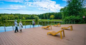 У Путяевского пруда в «Сокольниках» открыли новую зону отдыха с лежаками и настилом у воды